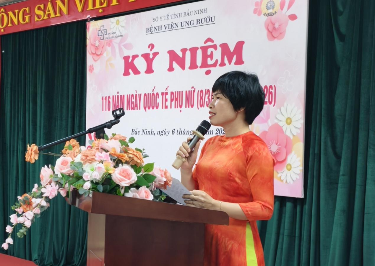 Ngày 06/03/2026, hòa chung không khí chào mừng Ngày Quốc tế Phụ nữ 8/3, Bệnh viện Ung bướu Bắc Ninh tổ chức lễ kỷ niệm đầy ý nghĩa, hướng tới cột mốc 116 năm Ngày Quốc tế Phụ nữ. Đây là dịp đặc biệt để tri ân những đóng góp to lớn của nữ viên chức, người lao động trong sự nghiệp chăm sóc sức khỏe nhân dân.