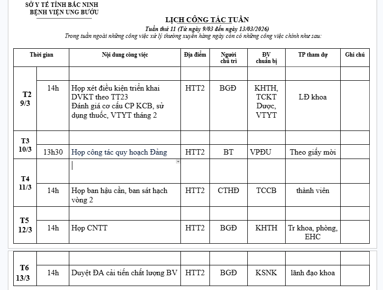 LỊCH CÔNG TÁC TUẦN 11(9/3-13/3/2026)
