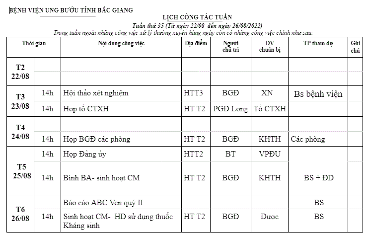 Lịch công tác tuần 35 (22/8 - 26/8)