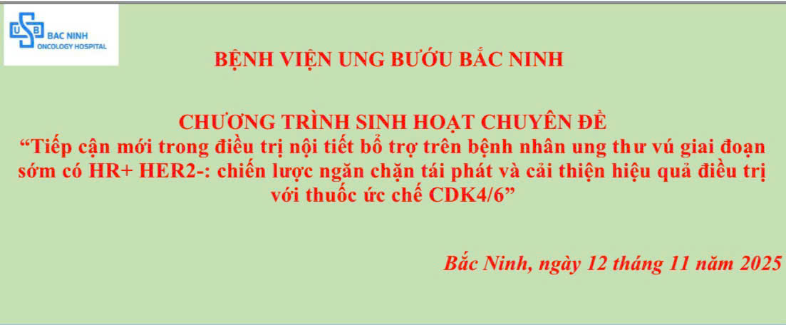 Chiều ngày 12/11/2025, tại Bệnh viện Ung bướu Bắc Ninh đã diễn ra buổi sinh hoạt khoa học chuyên đề với chủ đề: “Tiếp cận mới trong điều trị nội tiết bổ trợ trên bệnh nhân ung thư vú giai đoạn sớm có HR+ HER2-: Chiến lược ngăn chặn tái phát và cải thiện hiệu quả điều trị với thuốc ức chế CDK4/6”.