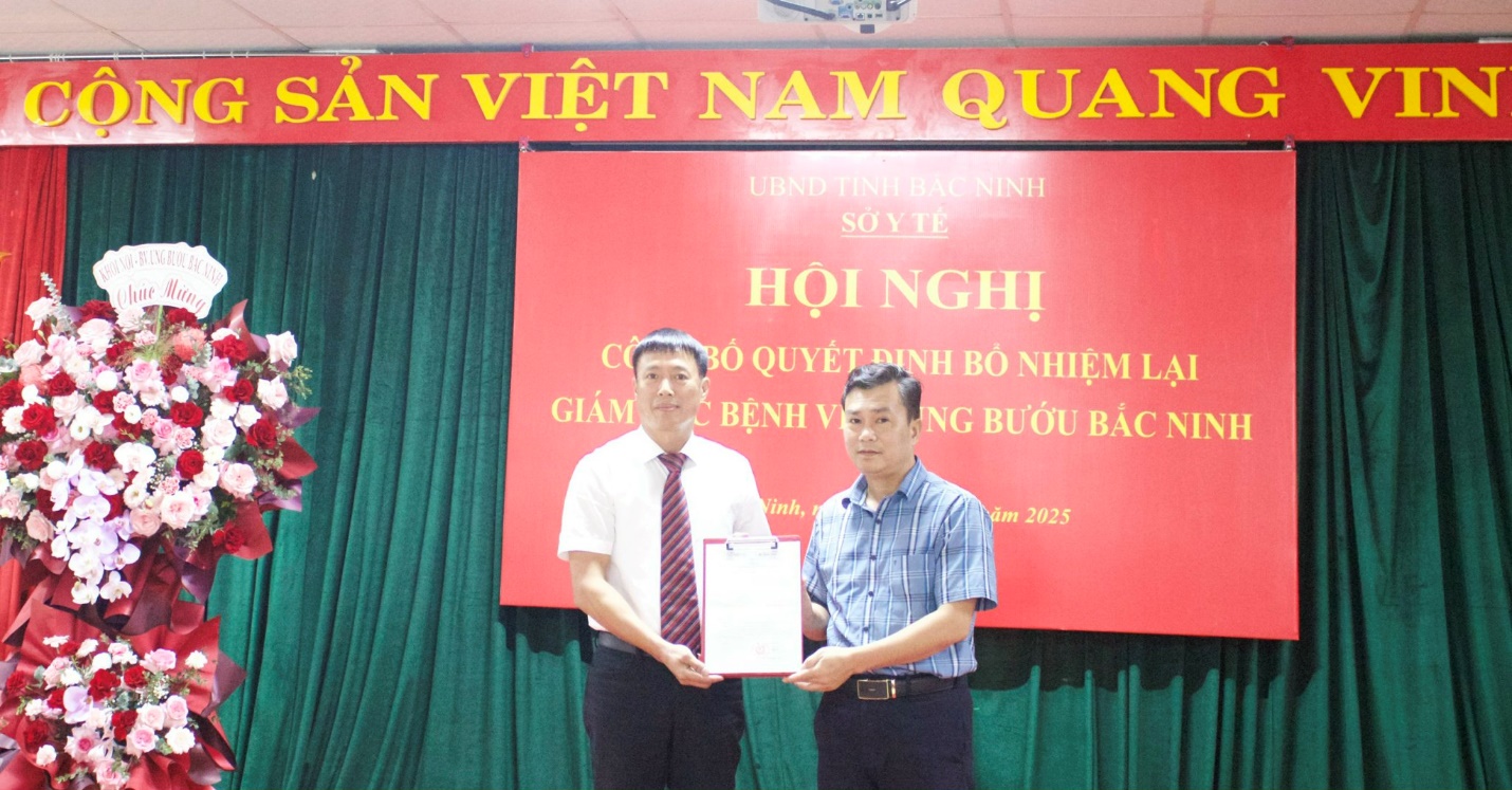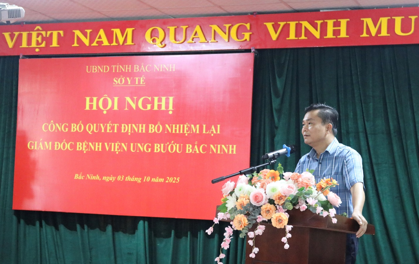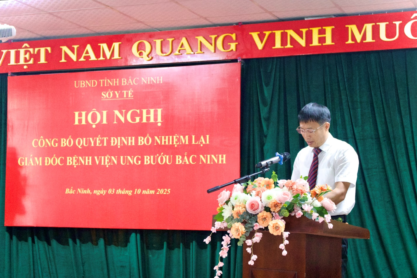 Chiều ngày 03/10/2025, tại Hội trường nhà A Bệnh viện Ung bướu Bắc Ninh, Sở Y tế tỉnh Bắc Ninh đã tổ chức Lễ công bố Quyết định bổ nhiệm lại Giám đốc Bệnh viện Ung bướu Bắc Ninh nhiệm kỳ 2025 - 2030 đối với đồng chí Nguyễn Danh Song.