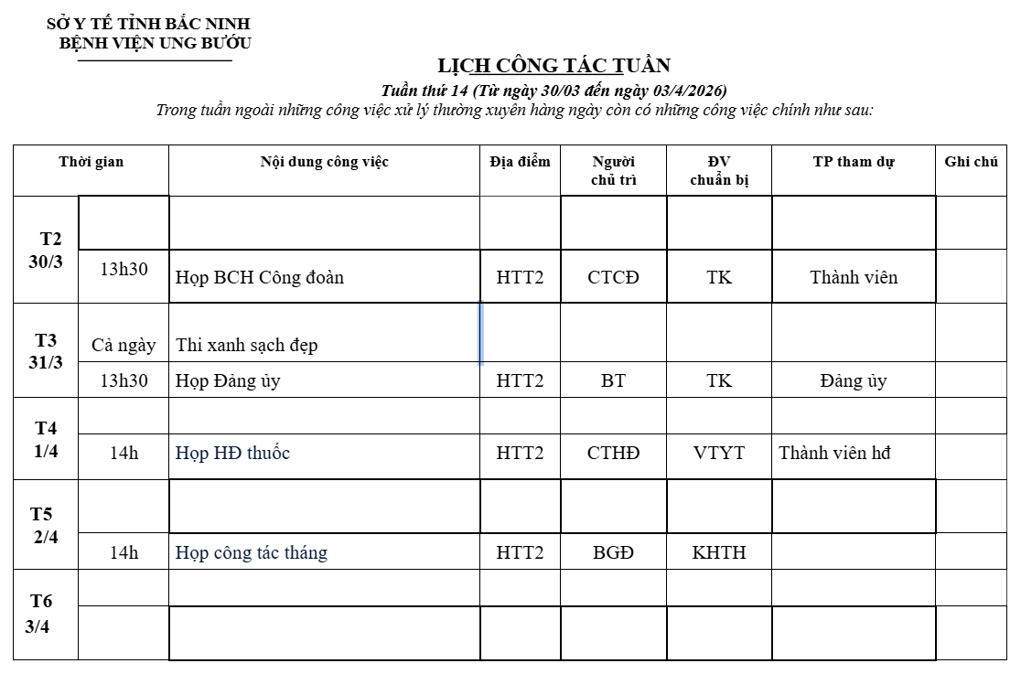 Lịch công tác tuần 14 (30/3-03/4/2026)