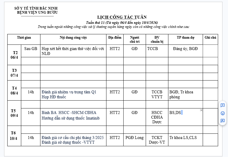Lịch công tác tuần 14 (30/3-03/4/2026)